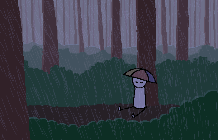 The person takes out an umbrella hat just as it starts pouring rain.
