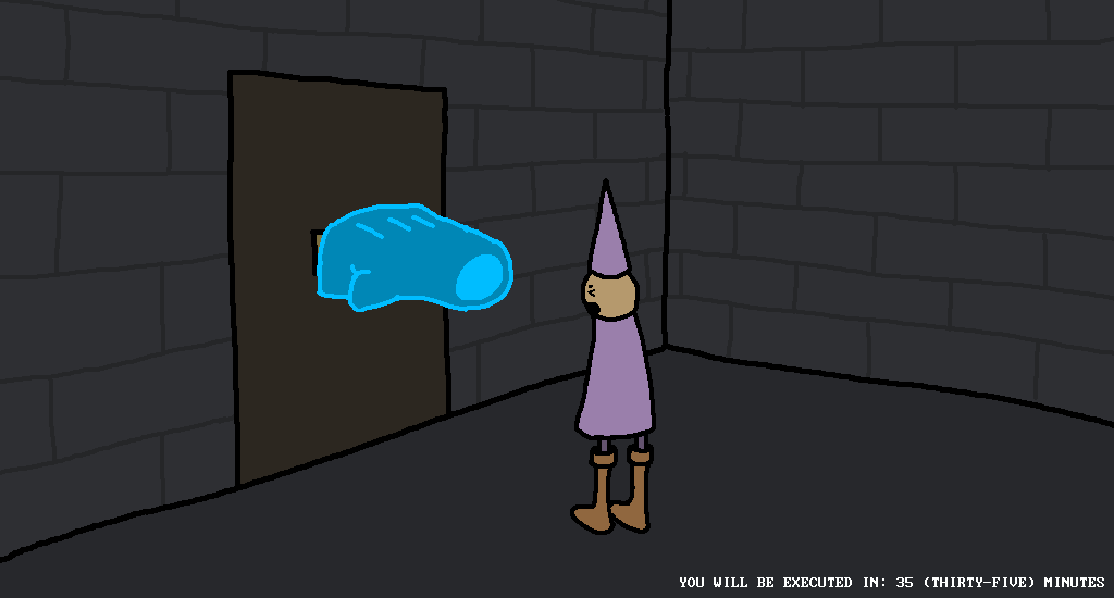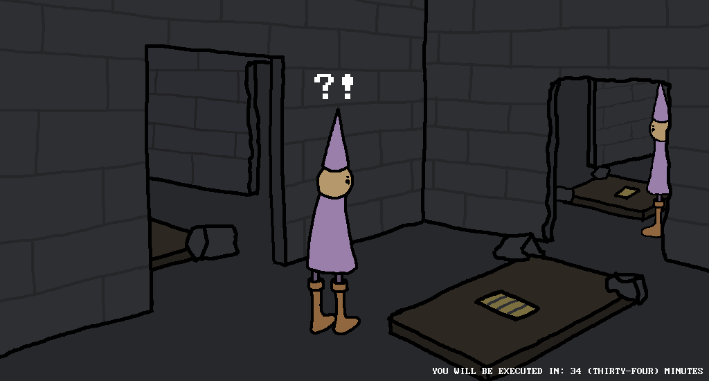 Breaking down the door opened a spatial loop in the dungeon from one wall to another wall! What the hell is happening! Clearly breaking down the door was not the correct way of breaking out of here!