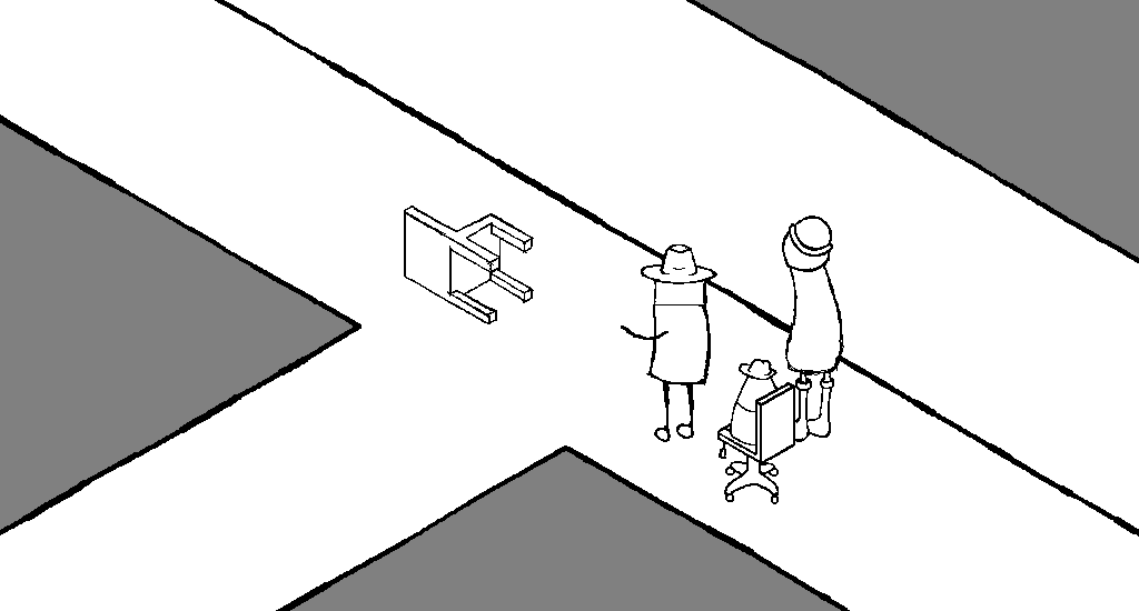 Victor walks back to the office, picks up the chair, walks back to this intersection and pushes it down the hall. It topples over because it doesn't have any wheels.