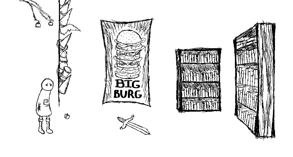You seem to have entered some form of LIMBO SPACE. There is no entrance or exit in sight in this area. There are no walls. There is an infinitely tall hat rack with various types of hats hung on it, looking up at it makes you dizzy. The sword that disappeared into your hat appears to have ended up here as well. There is a branch of an apple tree coming from nowhere and an apple on the ground with a slice missing. There is a BIG BURG poster on what would be a wall, you do not understand what this poster means however. There are two bookshelves full of books.