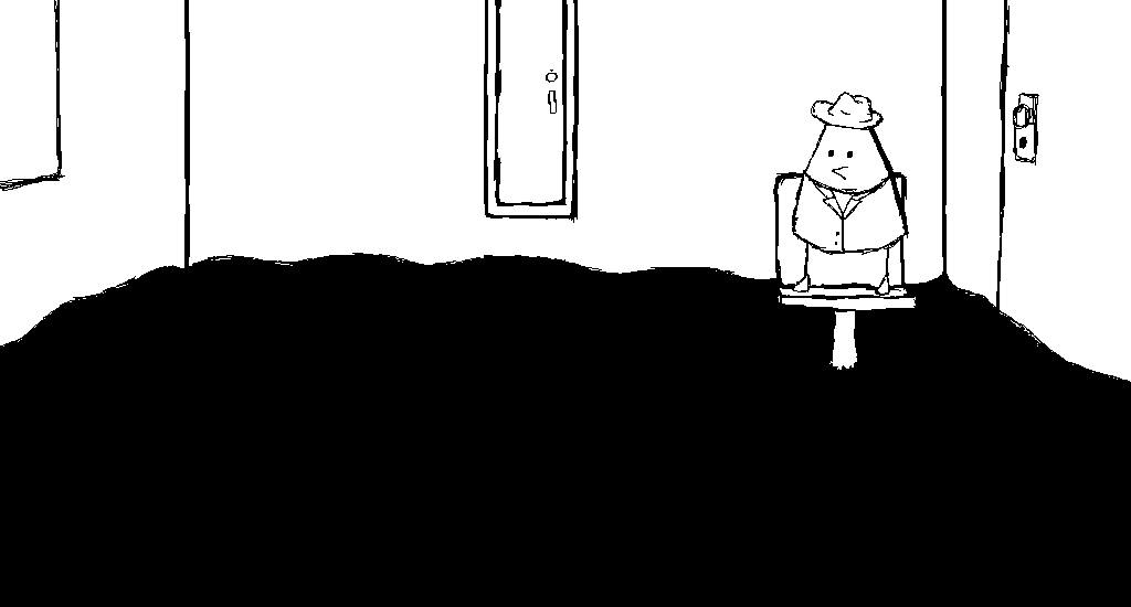 Through the hole you see a small, hard boiled man standing atop a swivel chair in an attempt to not touch a flood of MYSTERIOUS LIQUID in his room.