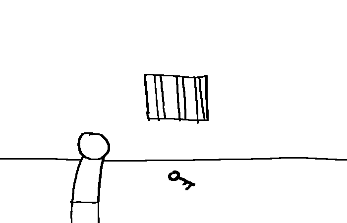 As you ponder the limits of two dimensional space, you remember you live in a three dimensional space and accidentally spin around to look at the other side of the cell revealing a barred window and a key.
