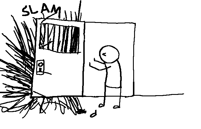 You unlock the door and slam it open, the guy gets caught in the swing and gets crushed against the wall.