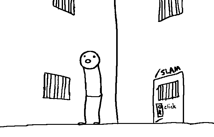 It appears to be a concrete courtyard in the middle of some prison cells, the door behind you shuts and locks itself.