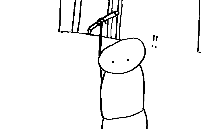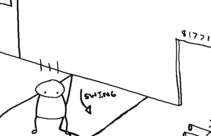 As you walk away the floor opens up beneath you and you start falling. You manage to catch yourself on a bent window bar on your way down, catching yourself before you fall to your death.