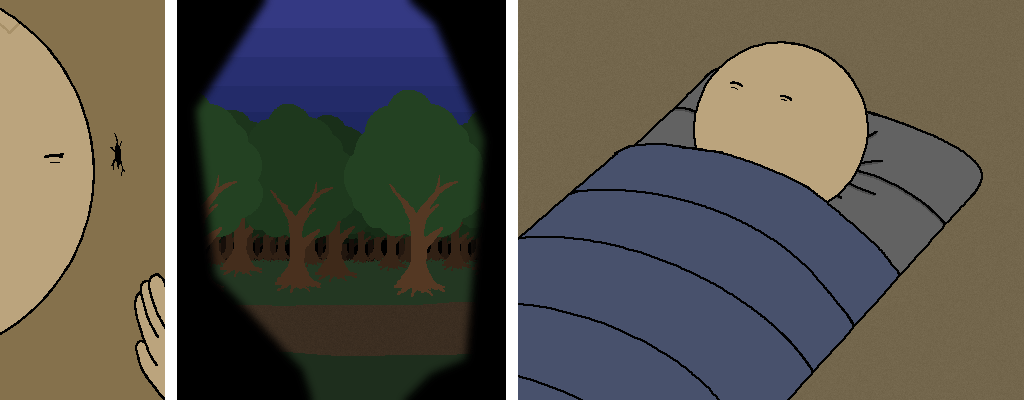Anyways, after making sure there isn't anything outside that seems suspicious, Hilbert gets into his sleeping bag.